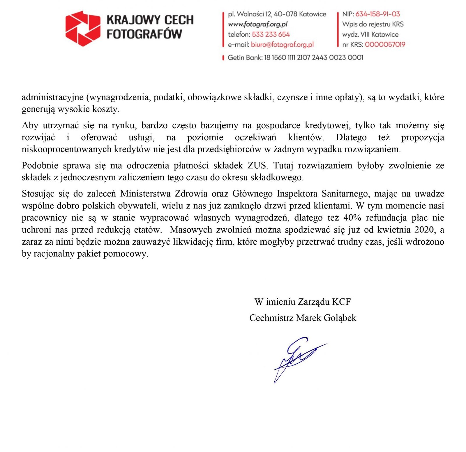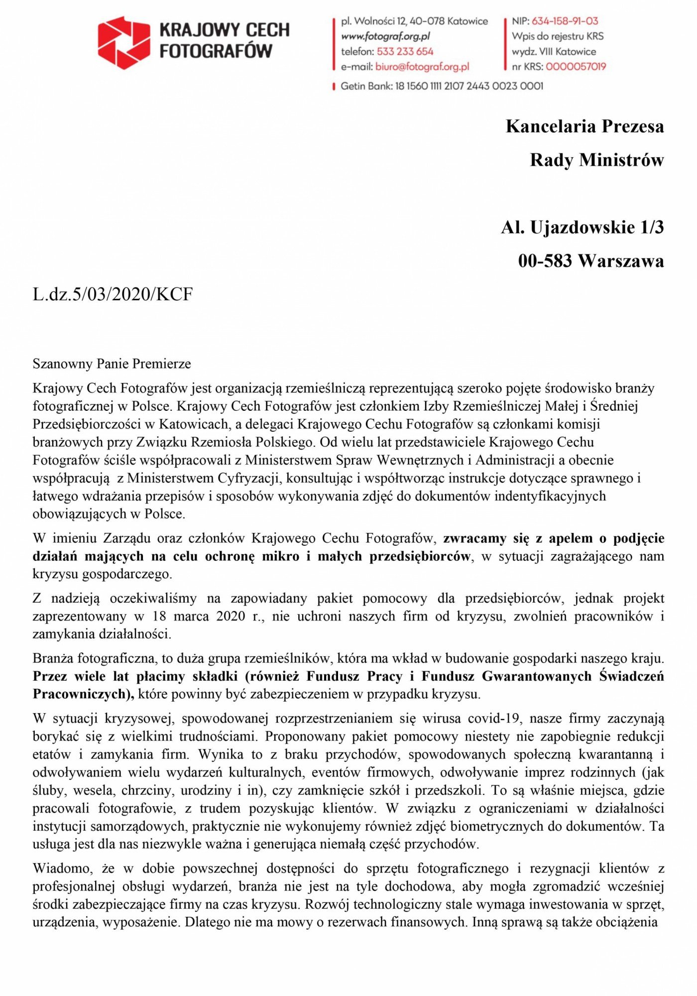 w dniu 24 marca 2020 wystosował pismo do Premiera Mateusza Morawieckiego, w sprawie wszystkich polskich fotografów. Dostaliśmy potwierdzenie pismem z podpisem kwalifikowanym o odbiorze i przekazaniu pisma do Pani Marii PROKOP, Dyrektor Biura Ministra, Ministerstwo Rozwoju oraz do wiadomości: Dyrektor Biura Ministra, Ministerstwo Cyfryzacji, Dyrektor Biura Ministra, Ministerstwo Rodziny, Pracy i Polityki Społecznej, Dyrektor Biura Ministra, oraz Ministerstwo Finansów.